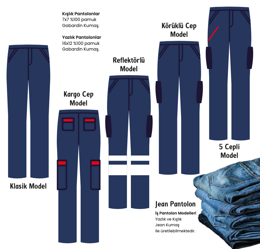 Dayanıklı kumaşı, rahat kesimi ve fonksiyonel cepleriyle profesyonel iş pantolonlarımız; çalışanlarınıza hem güvenli hem de konforlu bir çalışma deneyimi sunar. Tüm sektörlerin ihtiyaçlarına uygun kurumsal üretim yapılabilir.